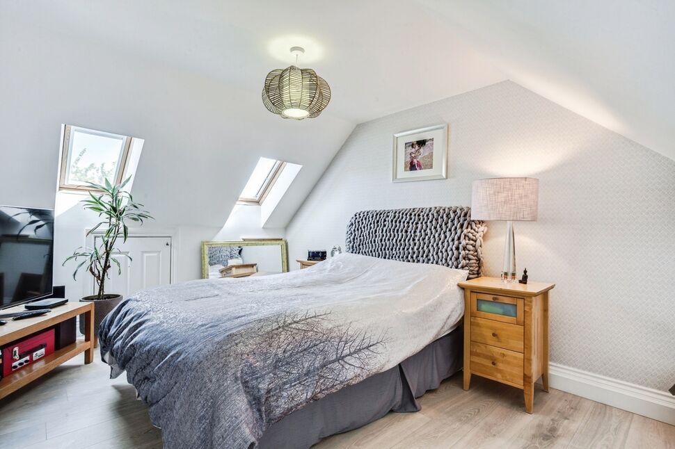 Double bedroom with fitted wardrobes, carpeted floor, gas central heating radiator and multiple Velux windows.