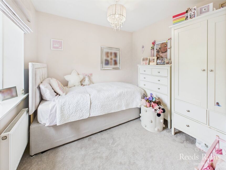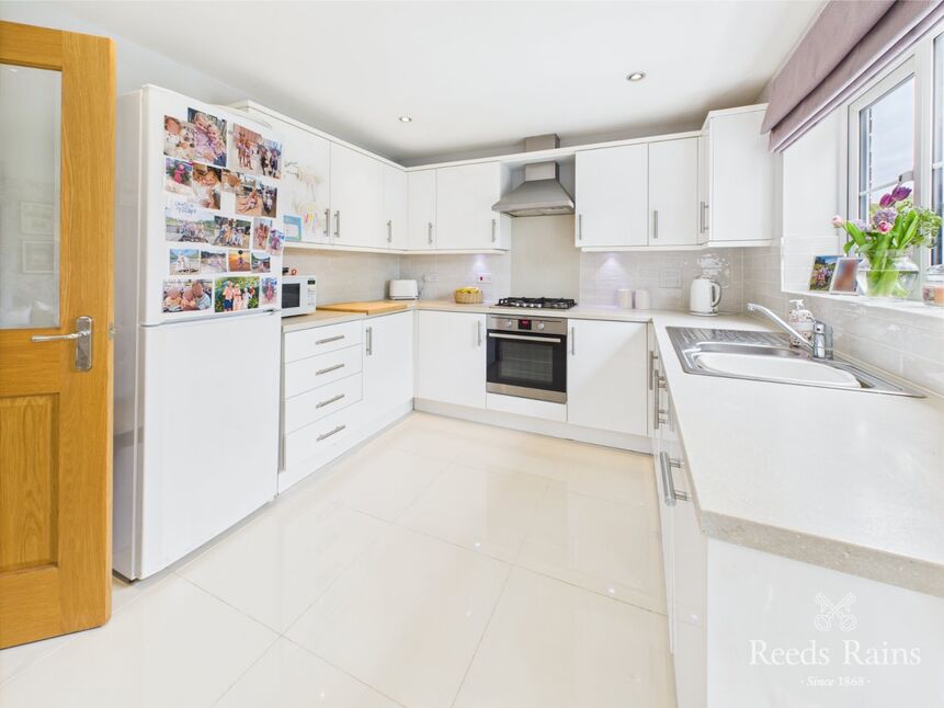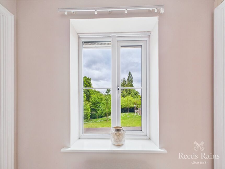 Step into the welcoming hallway, where an oak staircase, doors, and tastefully tiled flooring set the tone for the rest of the home. To the right, the beautifully decorated living room features a bay window that perfectly frames the scenic open field. The spacious 26-foot kitchen/diner, with French doors leading to the garden, offers a perfect space for hosting gatherings. Open-plan to the kitchen/diner sits a second reception room, currently used as a snug, adding flexibility to this family home.