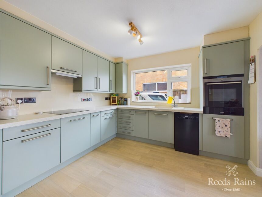 A modern and well equipped modern kitchen with both wall and base units with worktop over, electric hob with extractor over, oven, space for appliance and fridge-freezer, UPVC double glazed window and gas fired radiator. Opens into living room.