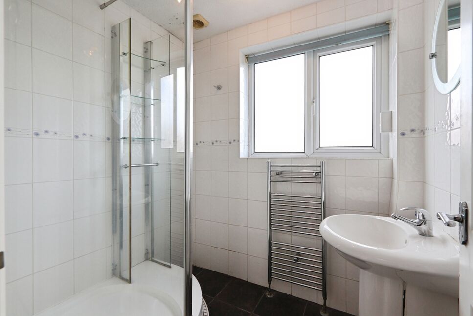 Walker corner shower unit with mains shower, pedestal wash basin, tiling to the walls and floor, ladder style radiator and double glazed window.