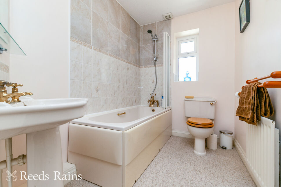 Double glazed window. Three piece suite comprising hand basin, WC and panelled bath with mixer tap and shower extension. Part tiled walls. Radiator.