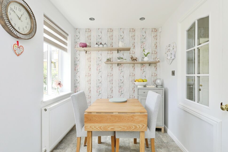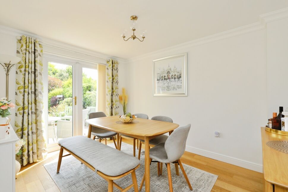 The kitchen is a chef's delight, equipped with integrated appliances, a utility room, and a dedicated dining space. Sleeping arrangements include four bedrooms, two of which are double-sized and feature en-suite bathrooms. The first double bedroom is light and airy, while the second comes with a walk-in wardrobe. The third bedroom is also double-sized and includes fitted wardrobes. The fourth bedroom is a single room, ideal for a child or as a home office.