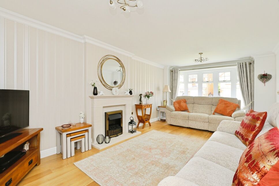 A spacious and beautifully decorated living room with wood flooring, central heating radiator, feature limestone fireplace with inset electric fire and front facing double glazed window.