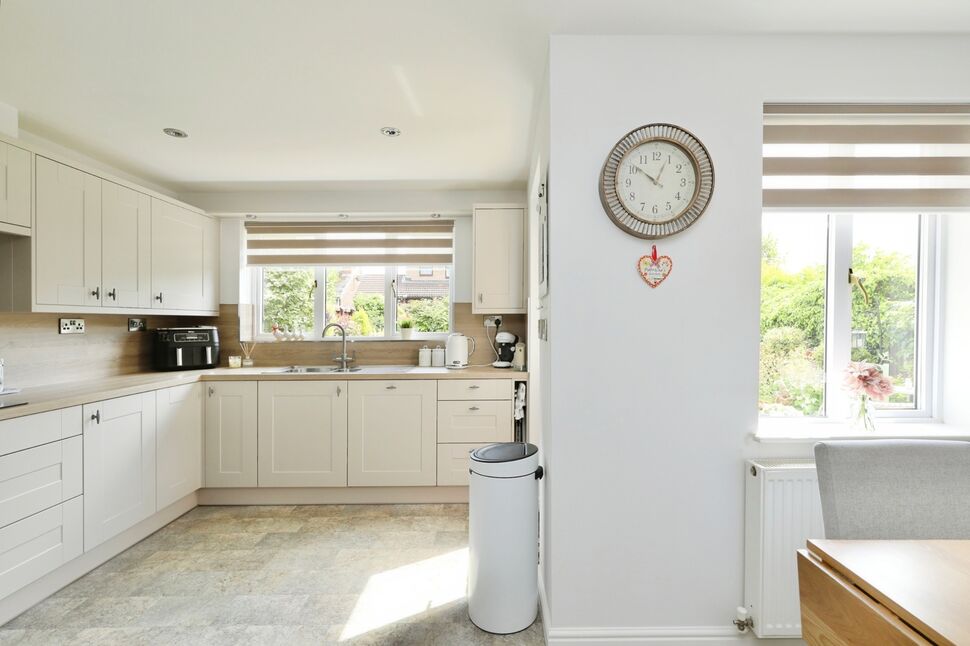 Modern kitchen dining room briefly comprising; a range of bespoke shaker style matching eye level and base units with wood effect worktops, inset sink and a half with drainer and mixer tap, integrated double electric oven, induction hob with extractor over and glass splash back behind, integrated dishwasher and fridge freezer, dining space, spotlights to the ceiling, central heating radiator, vinyl floor covering, two rear facing double glazed windows providing a light and airy environment.