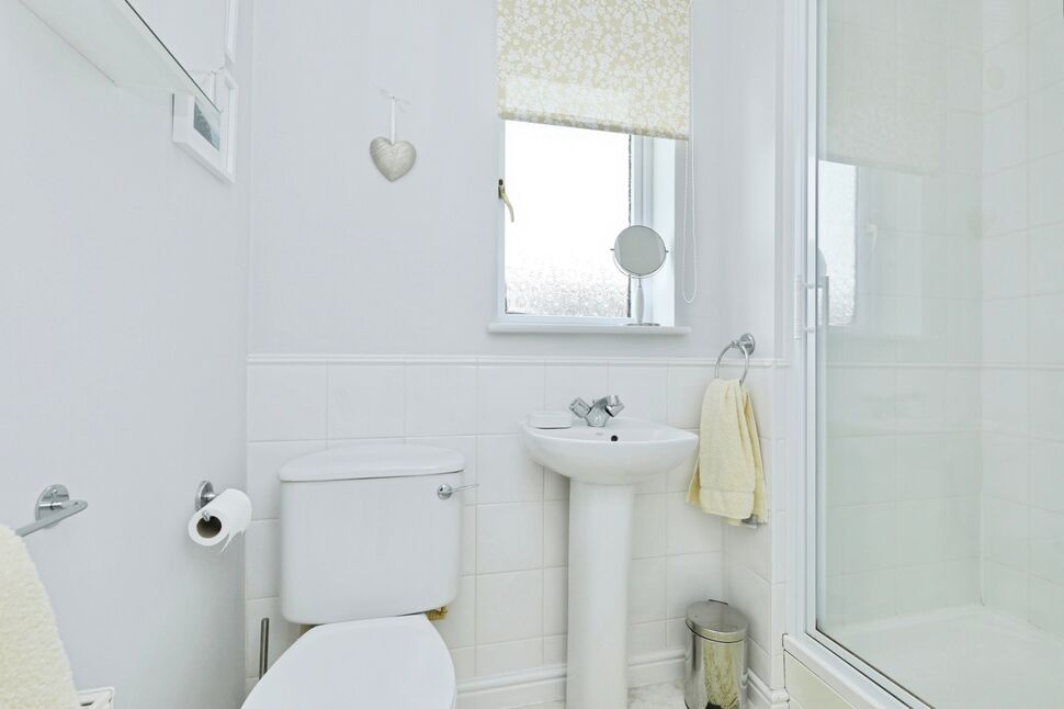 Briefly comprising; shower enclosure with mains shower inside, hand wash basin, W.C, central heating radiator, splash back tiling areas, spotlights to the ceiling and side facing double glazed obscure window.