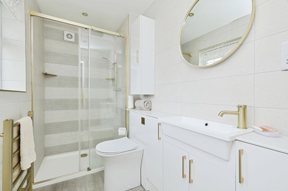 A newly fitted and stunning en suite to the master bedroom with shower enclosure with mains waterfall shower and shower head, hand wash basin and W.C within a vanity unit, heated towel rail, shavers point, fully tiled walls, wall mounted medicine cabinet, spotlights to the ceiling, LVT floor covering and front facing double glazed obscure window.