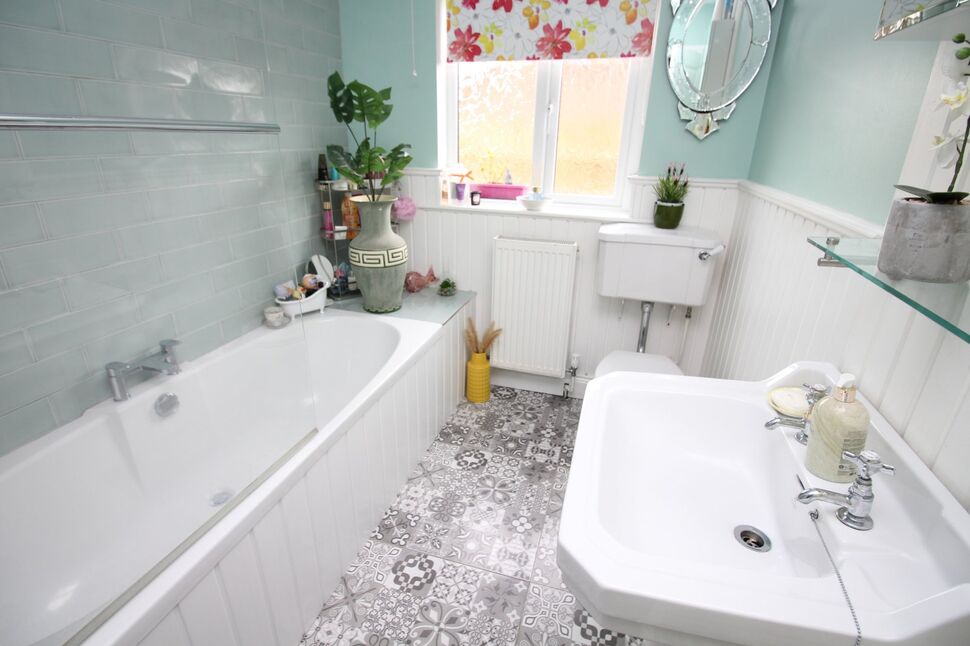 White suite comprising panelled bath with rain head shower and shower attachment, pedestal wash hand basin and low flush wc. Part tiled walls and tiled floor.
