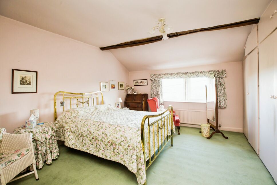 A double bedroom with a window to the front looking over the surrounding countryside and exposed beams to the ceiling and walls.