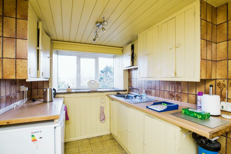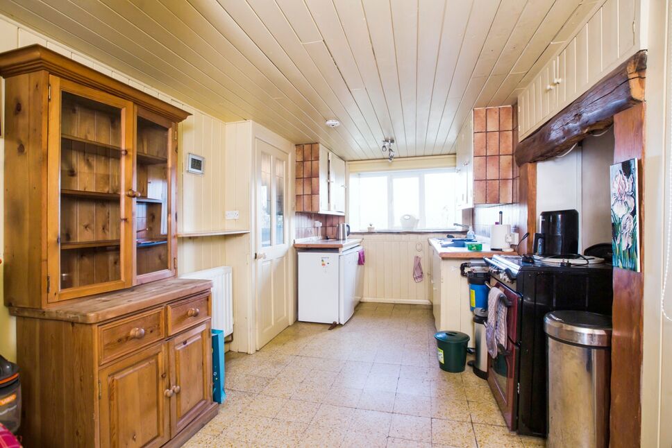 Wall and base units plus fixed shelving. Work surfaces with an inset sink and drainer unit. Plumbed for a washing machine and a dishwasher. Window to the rear.
