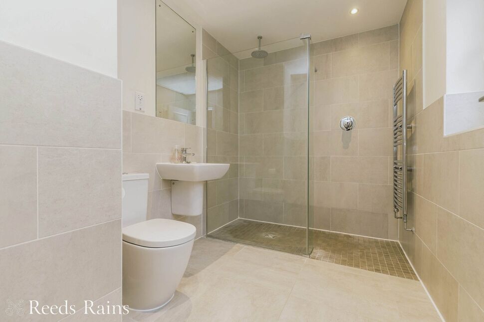 Side facing double glazed window. Three piece suite comprising handbasin, WC and large wet room style shower with rainfall showerhead. Part tiled walls. Tiled floor. Heated towel rail. Shaver point.