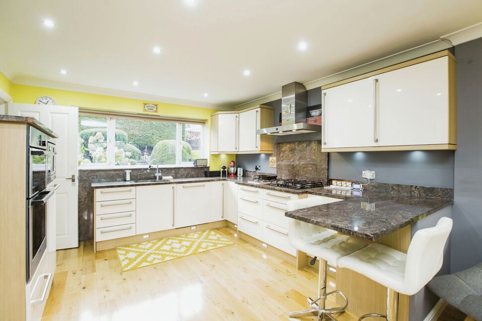 A well laid out kitchen diner with a range of modern base and wall storage units with tiled splashbacks and integrated appliances including double electric oven, inset microwave, integrated fridge, dishwasher and stainless steel sink. There is also a breakfast bar along with wooden flooring throughout.