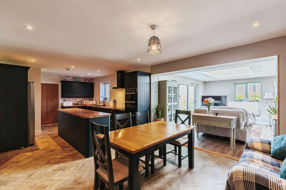 The heart of this home is undoubtedly the open-plan kitchen, which is both practical and stylish. It features a convenient kitchen island, providing plenty of workspace for culinary exploits, and is equipped with modern appliances that will make any food preparation a breeze. This space has been designed to encourage social interaction, making it the perfect spot for family gatherings and entertaining friends.