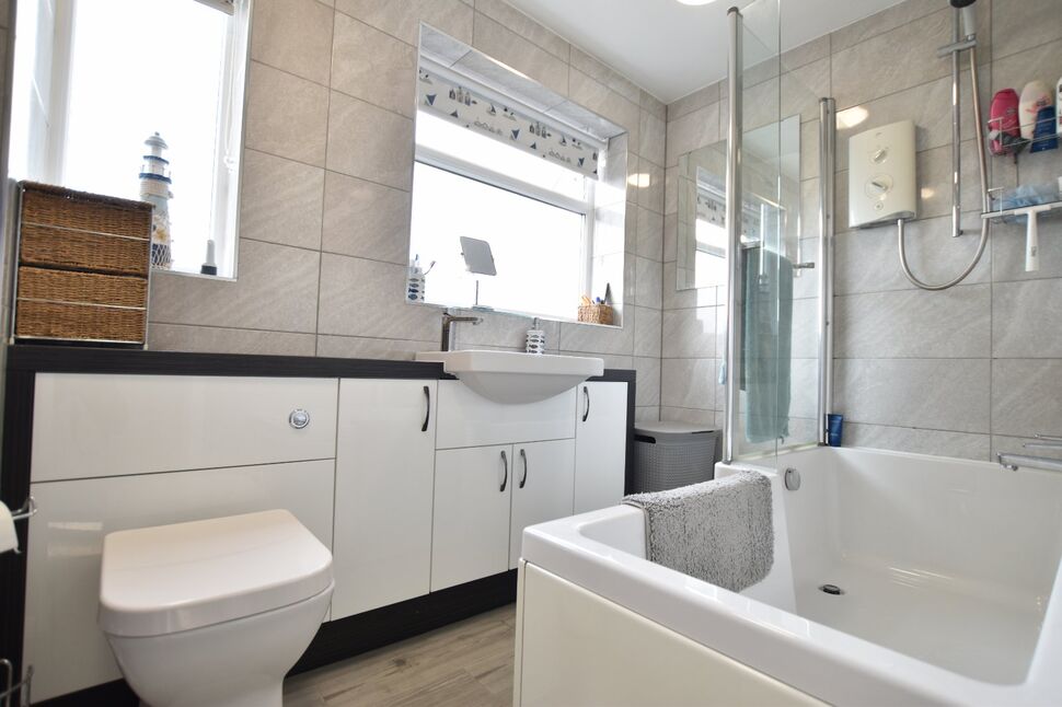 Formerly a four bedroom property, the owners have created a master bedroom suite to create a light and open space with dressing area, there are two further bedrooms and recently re-modelled bathroom, complete with white suite, shower over the bath, heated towel rail, all complimented by attractive grey tiling.