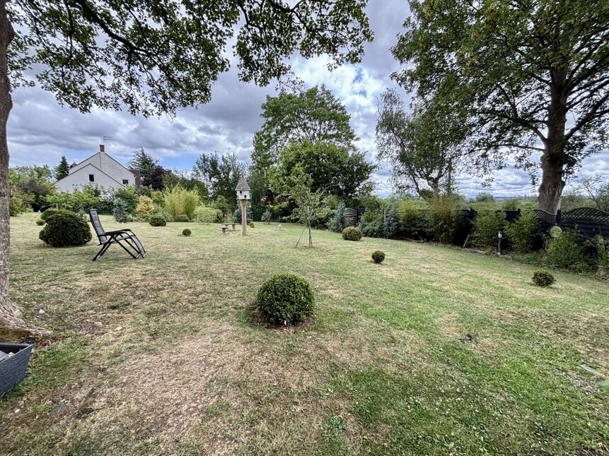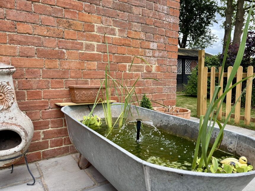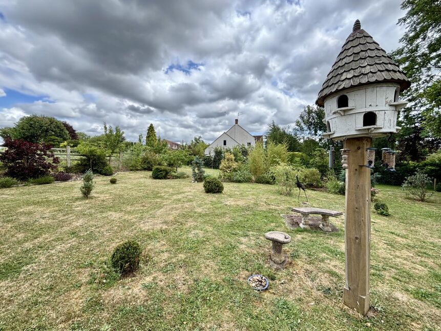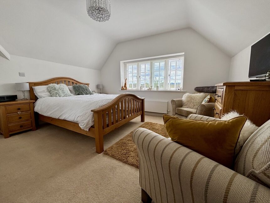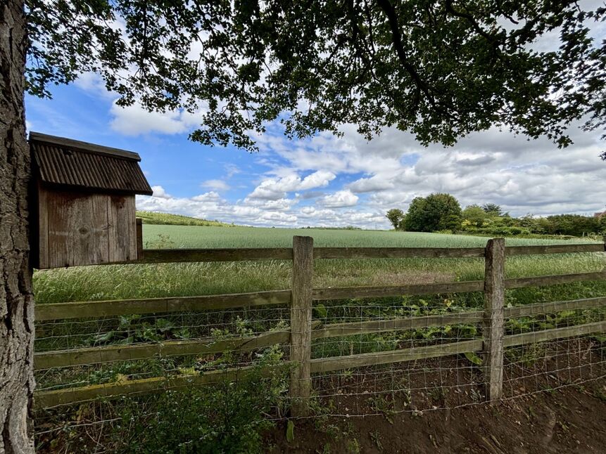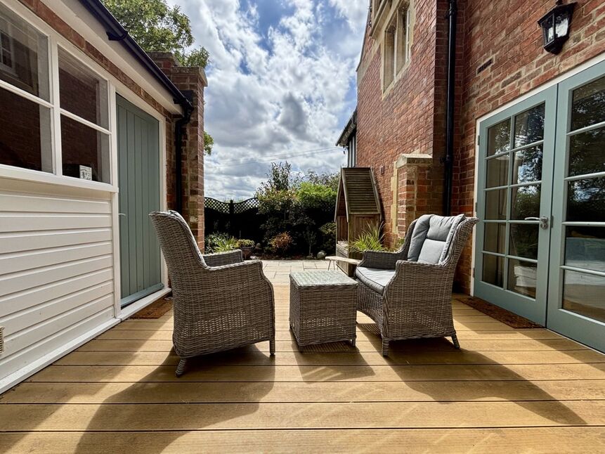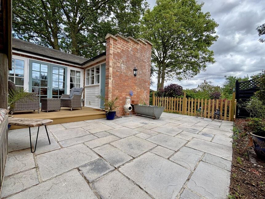 The south-facing garden is landscaped for both relaxation and entertaining, with a terrace, formal lawn, wildflower areas, and mature trees, boasting unspoilt rural views to the rear.