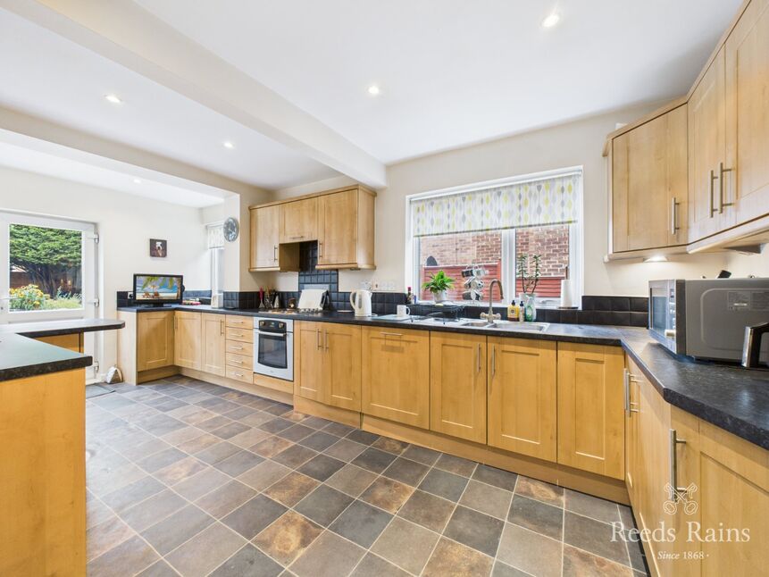 Beautifully extended to create a spacious and functional heart of the home, this kitchen offers generous workspace and a welcoming breakfast bar — perfect for casual dining or morning coffee. Illuminated work surfaces highlight the practical design, while ample space for a range of appliances ensures everything is in its place. Direct access to the garden makes it ideal for summer entertaining or family living.