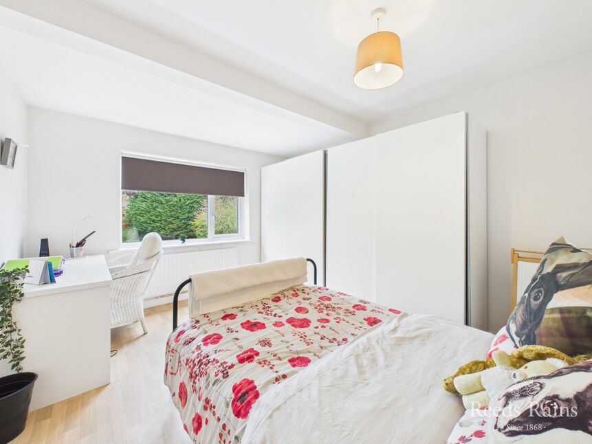 A bright and inviting bedroom overlooking the rear garden, featuring fitted wardrobes that provide excellent storage while maintaining an uncluttered look.