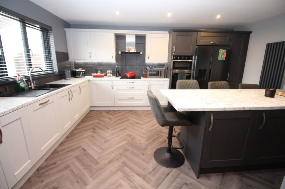 Excellent range of fitted high and low level units and breakfast bar. One and a half bowl stainless steel sink unit with mixer tap. Built in hob and oven. Extractor fan. Part tiled walls. Integrated dishwasher. Free standing fridge freezer. Part tiled walls.