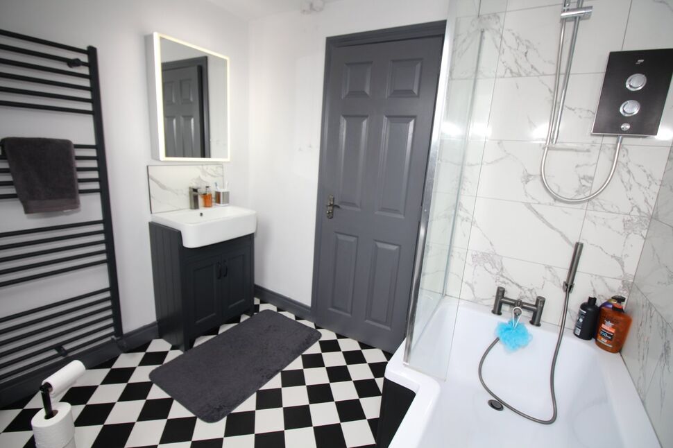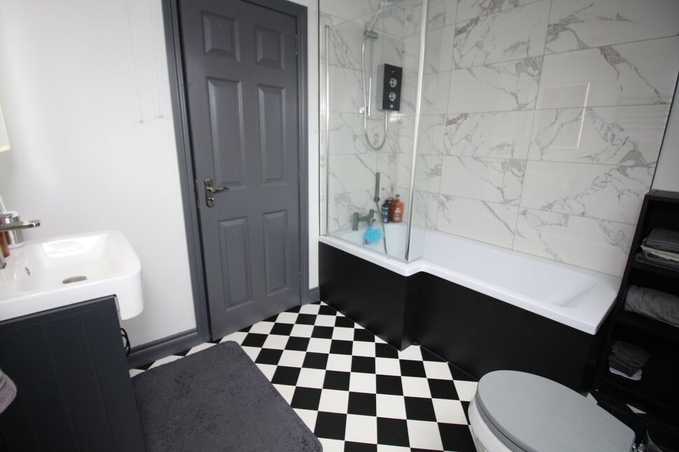 White suite comprising panelled bath with wall mounted electric shower, vanity unit and low flush wc. Wall mounted heated towel rail.