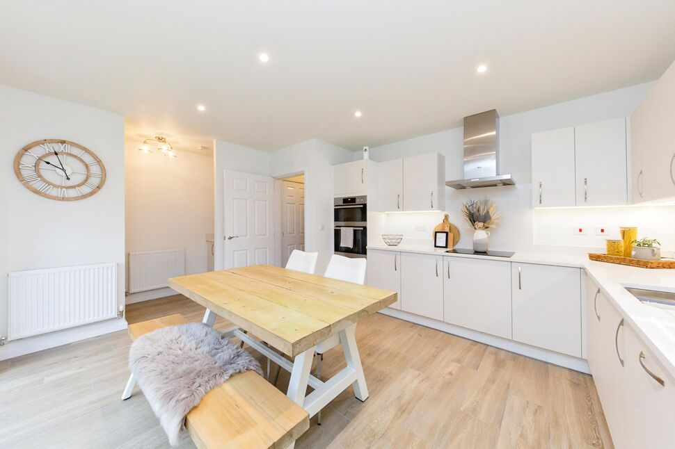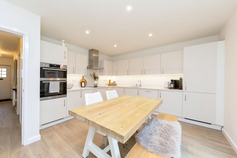 Modern range of wall, drawer and base units with preparation worktop, Electric double oven, Induction Hob. Integrated appliances include, Washing Machine/Dryer, Dishwasher, Fridge Freezer. French doors leading to the rear garden