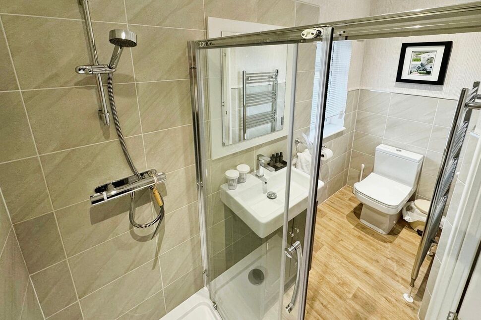 Spacious modern bathroom with W/C Storage cupboard with sink, large shower, heated towel rail and frosted window.