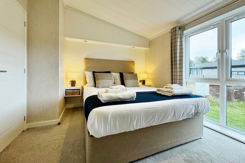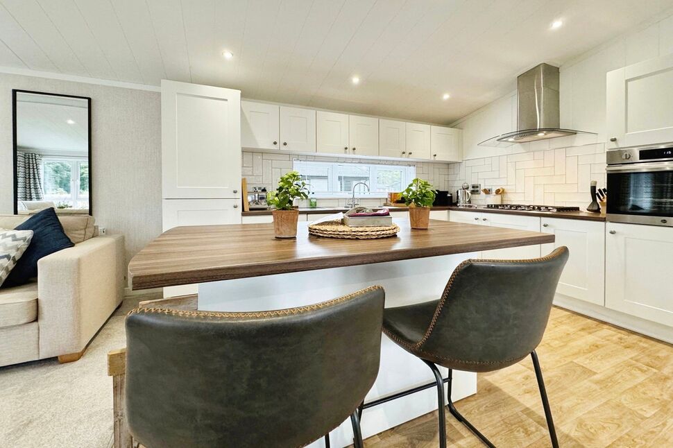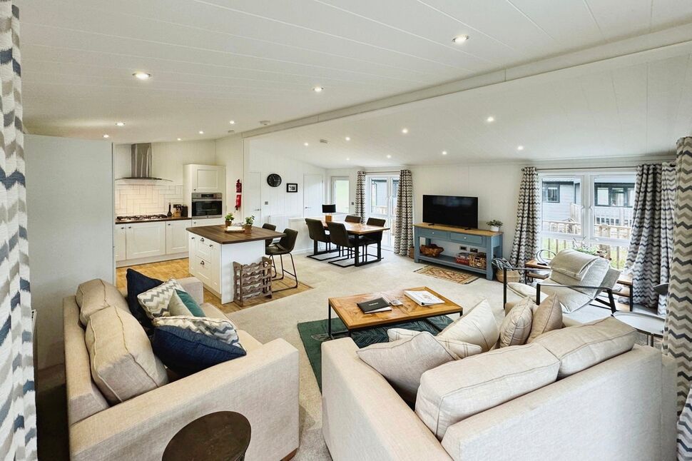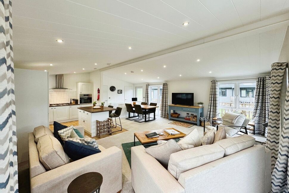 Impressive large kitchen area featuring island perfect for hosting and dining, integral dishwasher, fridge freezer and gas hob with electric oven. Wall and base units with a modern clean line, added luxurious tilling and upgraded extras, heart of the lodge with space for dining, relaxing and outside entertainment all in one, the perfect combination.
