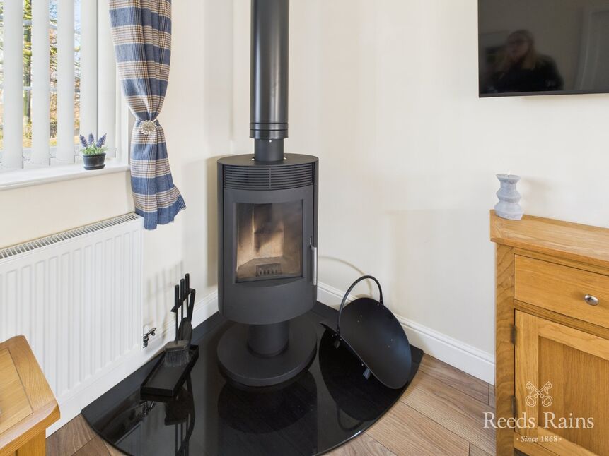 Featuring a beautifully fitted cream country-style kitchen with complementary work surfaces, an electric oven, gas hob with extractor unit, stainless steel sink and drainer, under-counter fridge, and microwave. The living area boasts wood-effect flooring, a double-glazed window, and a gas central heating radiator for ultimate comfort. Adding to its appeal, the property now benefits from a new, contemporary, and generously sized wood-burning stove, creating a warm and inviting ambiance, perfect for relaxing evenings.