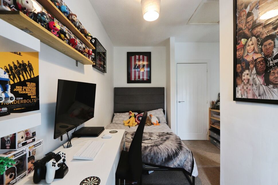 A spacious master bedroom with fitted carpet, central heating radiators, bespoke built in wardrobes and two rear facing double glazed windows providing a flood of natural light.