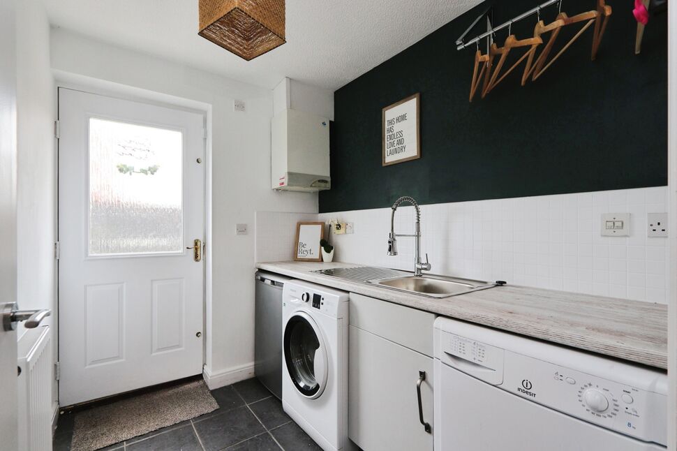 Briefly comprising; inset sink and drainer with mixer tap, complimentary splash back tiling, space for a washing machine, tumble dryer and fridge freezer, tiled flooring and rear facing door providing access to the rear garden.