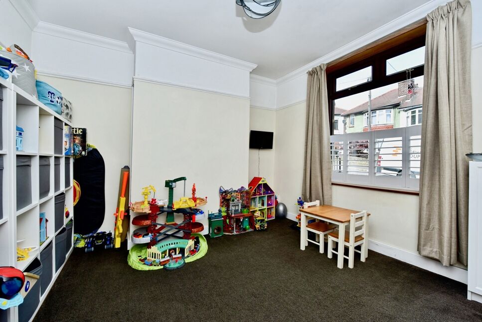 The second reception room, which may serve as a dining room or playroom, features large windows, wooden floors, and offers plenty of natural light.