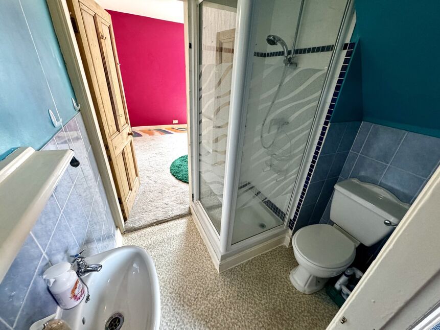 Comprised of a three piece suite which includes; step in shower cubicle, wash hand basin and a low level WC. Part tiled walls.