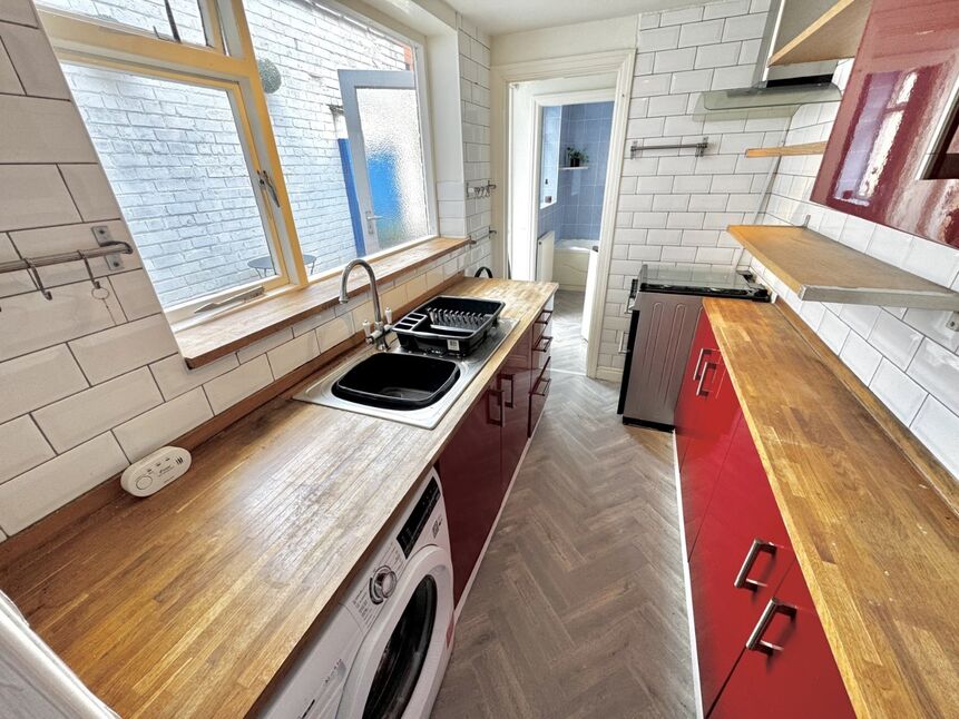 Galley style kitchen with a range of wall and base units with work top surface areas with inset sink unit. Space for a cooker, washing machine and fridge / freezer. Tiled walls and a window to the side elevation. Doorway to a vestibule.