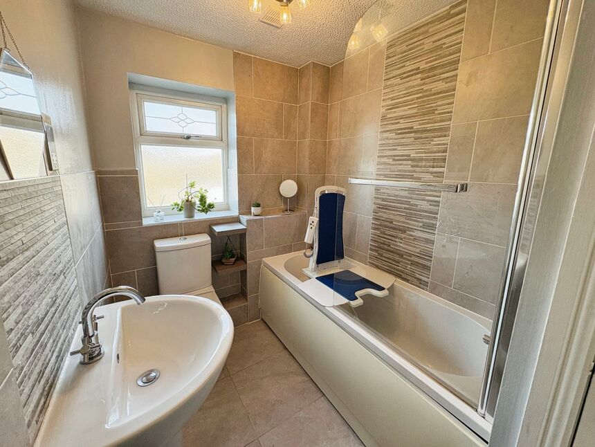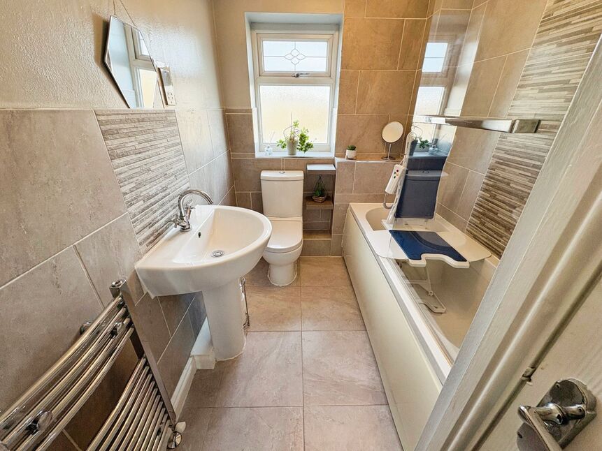 The bathroom with a front facing double glazed window, is well appointed with a three-piece suite in white. It consists of a panel enclosed bath with a shower over, pedestal wash hand basin and a low flush w.c. A majority of the walls are tiled in ceramic tiling. Handy built in storage cupboard. A towel radiator completes this room.