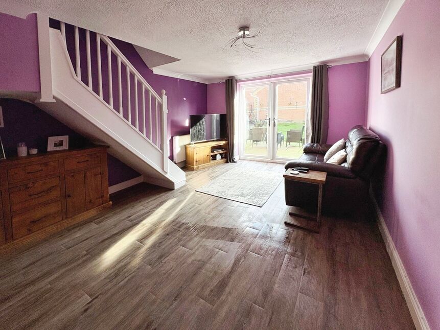 A spacious lounge which has ample natural light from the double-glazed French doors that provide access to the rear garden. The space features an open-plan staircase leading to the first floor, installed with a radiator ensuring the room stays warm in the colder months. You will then find space for a dining table enhancing the rooms appeal.