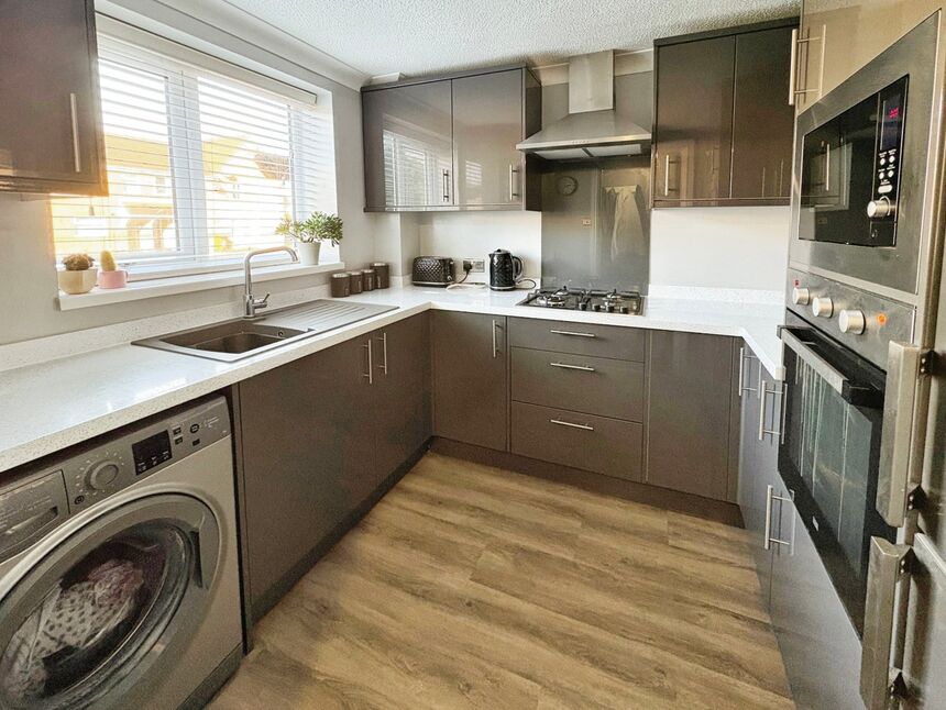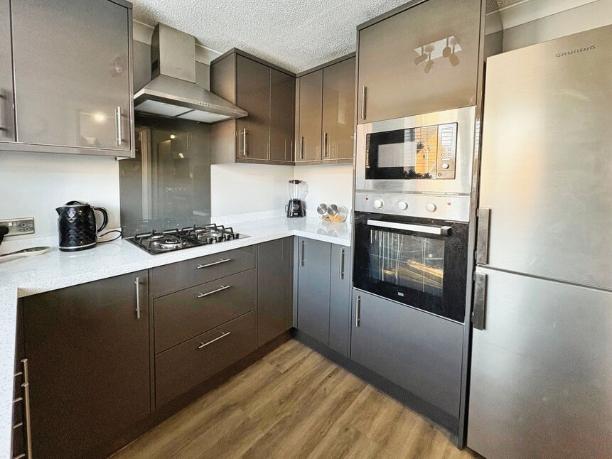 A stylish kitchen, featuring a double-glazed window overlooking the front. A well-fitted space that includes a range of modern base and wall-mounted cabinets in anthracite grey gloss finish with complementing laminated worktops. You will find a single sink inset with a mixer tap over. Fitted with a built-in four-ring gas hob with extractor chimney over. Eye level electric oven and a built in microwave is also to be included. The room is finished with serviceable floor covering, making it both practical and inviting.