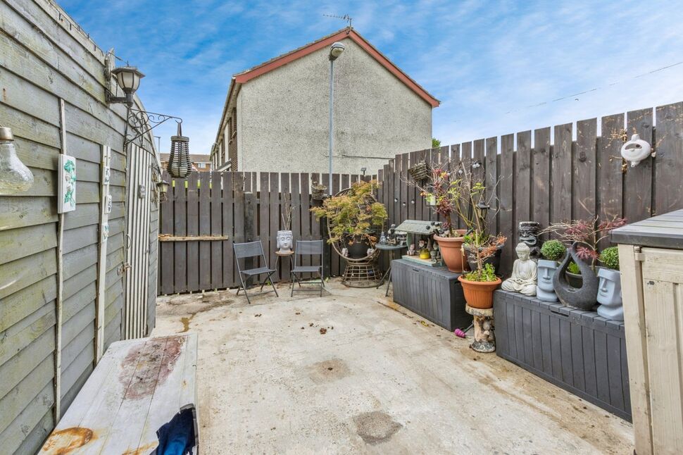 Front garden in artificial grass and shrubs. Enclosed garden to the rear in patio.