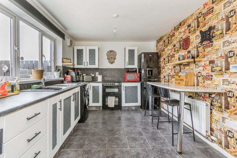 Single drainer 1.5 stainless steel sink unit with mixer taps, excellent range of high and low level units with laminated work surfaces, gas boiler, plumbed for washing machine, ceramic tiled floor, casual dining area.