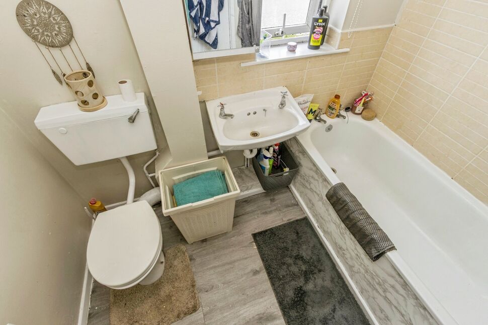 White suite comprising: Panelled bath with electric shower unit, wash hand basin, low flush WC, extractor fan.