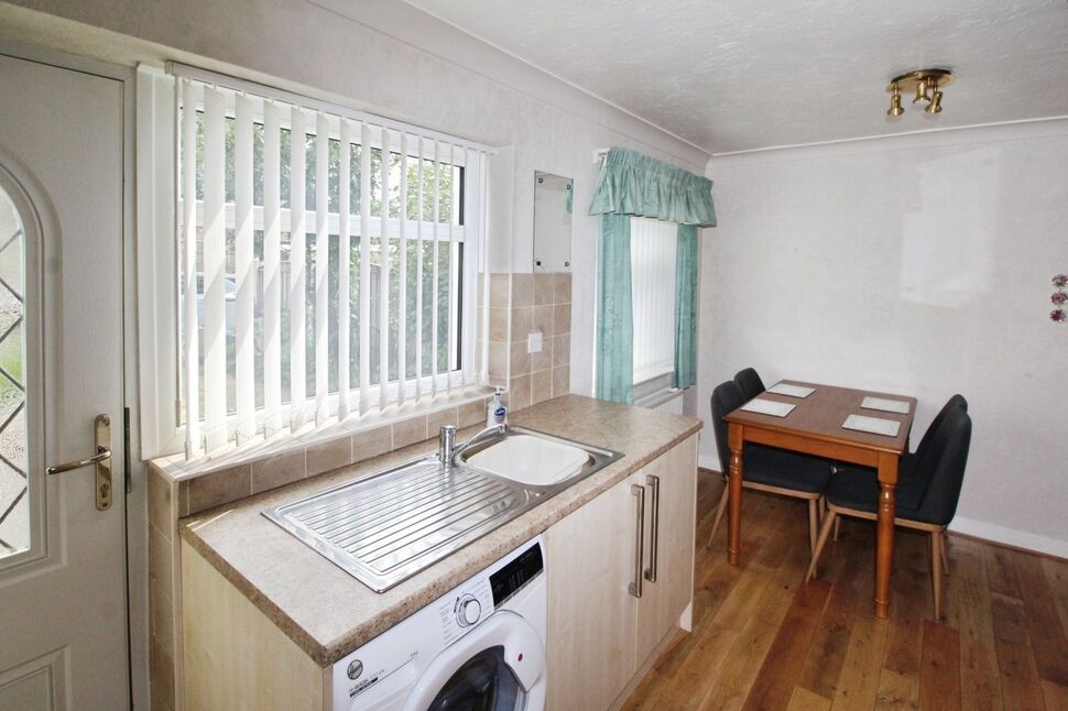 Fitted with a range of wall and base units. Work-surfaces incorporating a sink and drainer unit with mixer tap and tiled splash backs. Integral gas hob and oven with an extractor hood over. Space and plumbing for a washing machine. Central heating radiator. Rear facing double glazed window and exterior door to the garden.