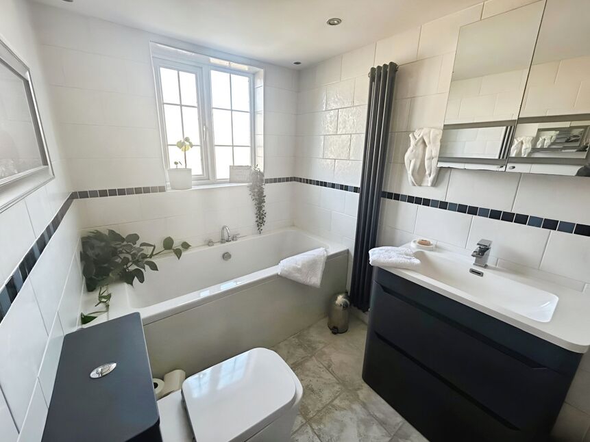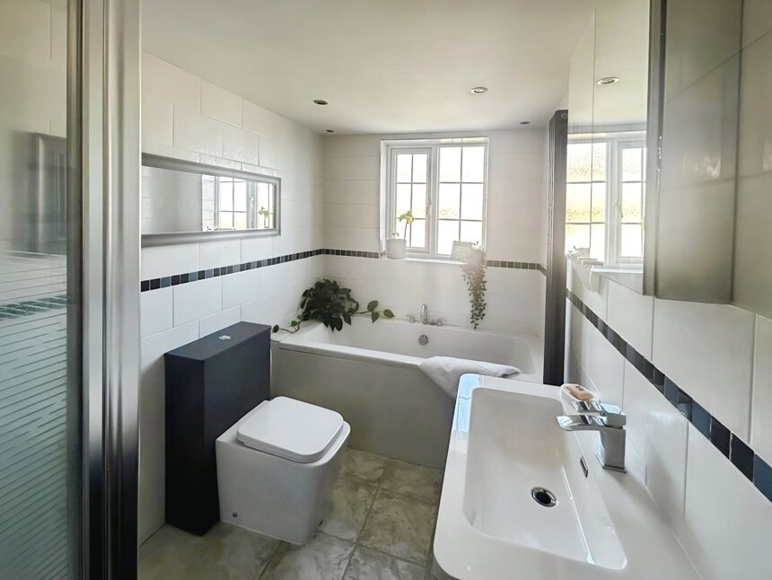 The bathroom is fully tiled and fitted with a wash hand basin, a wc, a bath, shower cubicle and rear facing PVCU double glazed window.
