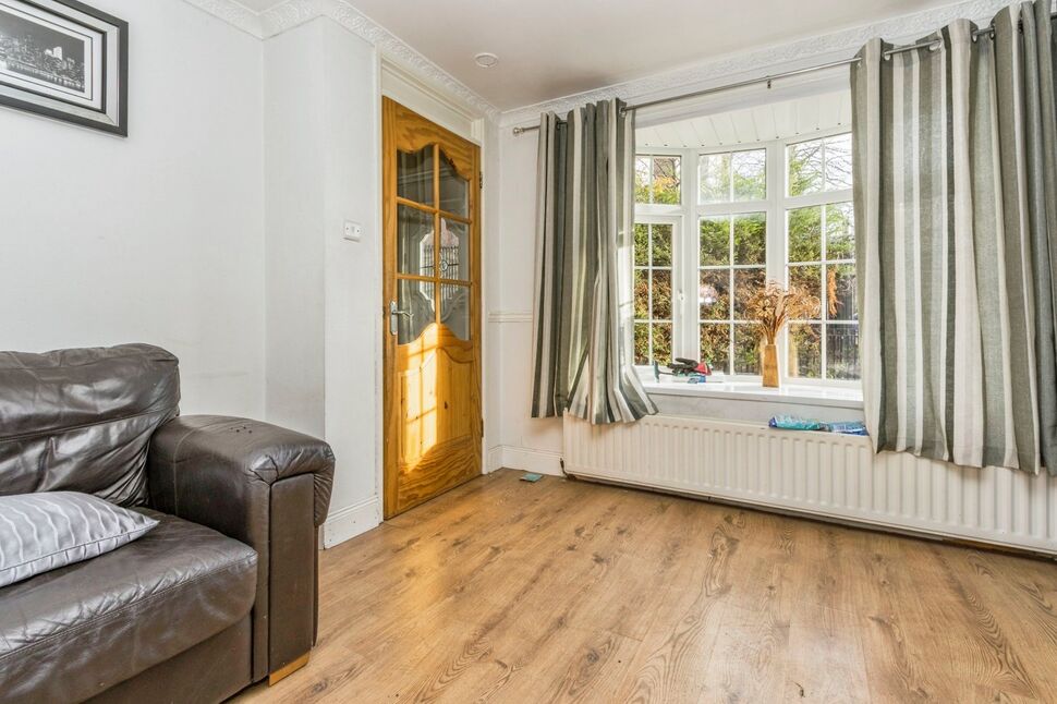 The spacious living room offers a bright bay window, electric fire, laminate flooring and ceiling cornicing.