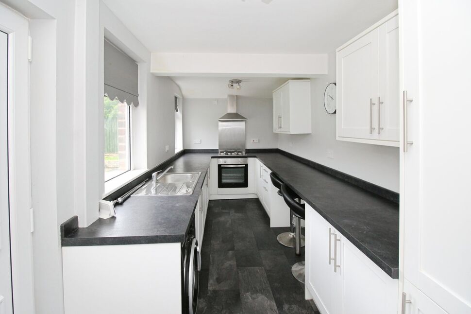 Two side facing double glazed windows and door leading to the side and rear gardens. Range of wall and base units with work top surfaces and stainless steel sink unit with mixer tap. Integrated electric oven and four ring gas hob with extractor hood over. Plumbed for washing machine.