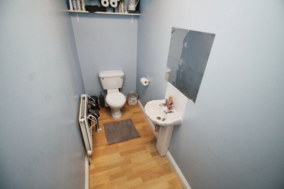 Panelled bath, pedestal hand wash basin, part tiled walls, W.C., radiator.