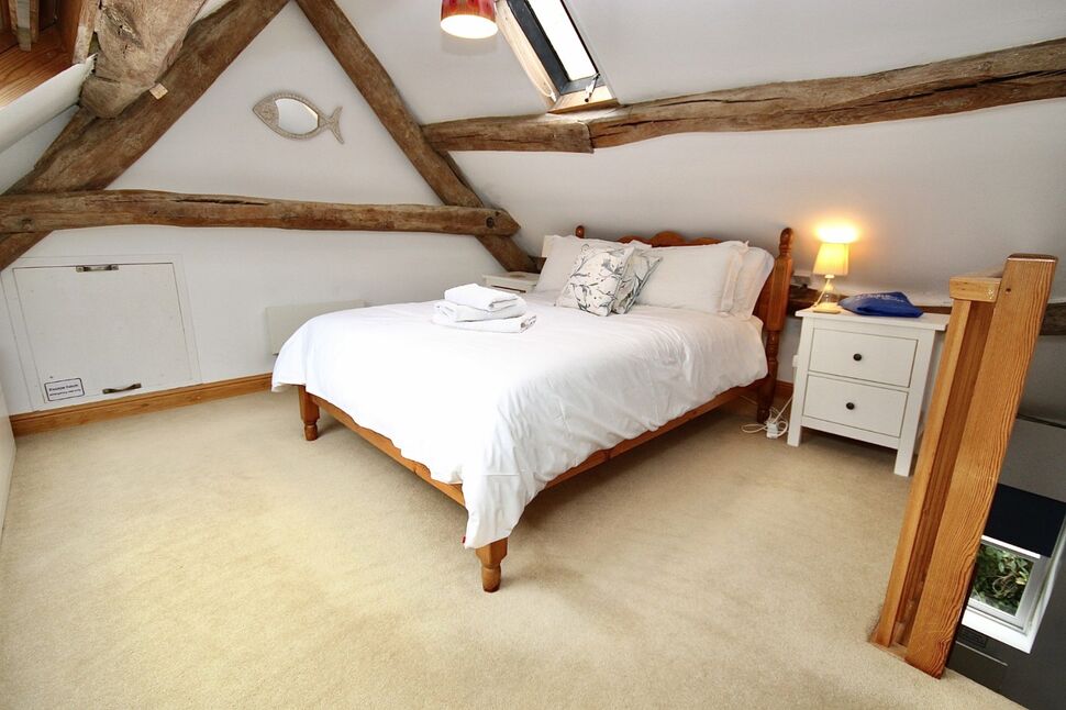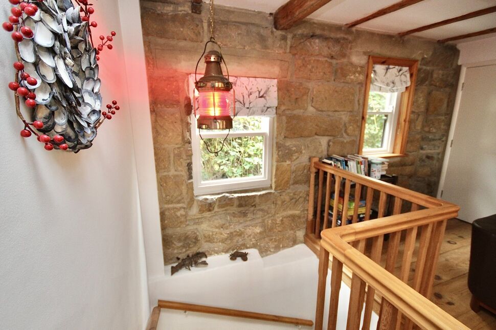 A staircase leads to the first floor, where you will find a central living room that has been thoughtfully designed to showcase exposed sandstone walls, ceiling beams, and an open cast iron fireplace. This floor also includes a bedroom and a bathroom, adding to the comfort and functionality of the home.