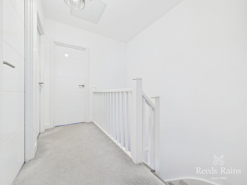 The central landing connects all three bedrooms and the family bathroom. This space includes a built-in storage cupboard and access to the loft.