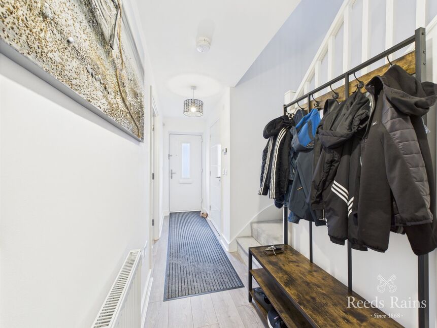Accessed from the front through a smart double-glazed composite entrance door. A wide and welcoming entrance hall sets the tone for the rest of the home spanning 16 feet in length. Finished with sleek laminate flooring and clean white walls, this space benefits from a built-in storage cupboard and access to the ground floor cloakroom. A radiator provides warmth and completes this bright and functional arrival space.