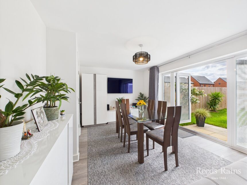 - The front-facing kitchen-diner includes sleek grey units, integrated Bosch appliances, and a dining area filled with natural light. To the rear, the bright sitting room opens through French doors to a sunny, south-west facing garden.