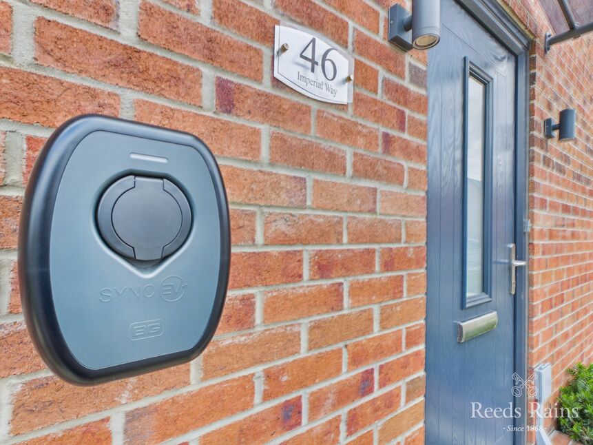 - The exterior offers a two-car driveway with an EV charging point and an enclosed rear garden.
