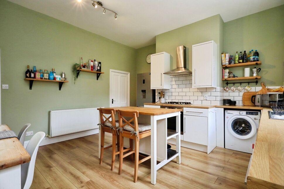 Spacious kitchen/dining room fitted with a stylish range of wall and base units. Work surfaces incorporating a sink and drainer unit with mixer tap and tiled splash backs. Integral gas hob and electric oven with an extractor hood over. Plumbing for a washing machine and dishwasher. Door to the cellar stairs. Rear facing double glazed window and exterior door to the garden.