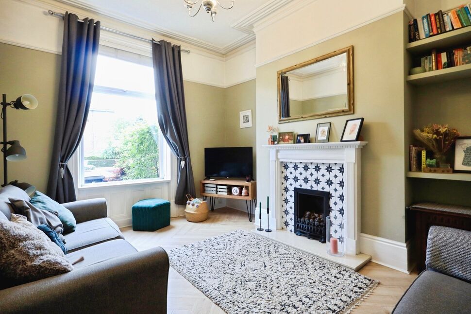 A light and airy main reception room having a feature fireplace with an inset living flame gas fire with tiled surround. Ceiling cornice. Central heating radiator. Large front facing double glazed window.