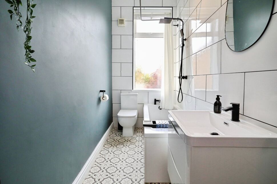 Fitted with a contemporary white bathroom suite comprising low flush WC, wash basin with storage below and a panelled bath with a mixer shower over. Part tiled walls. Central heating radiator. Rear facing double glazed window.